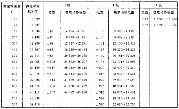 鎳鉻-鎳硅熱電偶電動(dòng)勢(shì)及允差(單位:uV)
