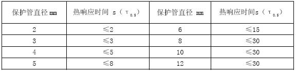 在溫度階躍變化時,溫度傳感器的輸出變化至量程變化的50%所需要的時間稱為熱響應(yīng)時間,用τ0.5表示。影響τ0.5的因素與保護管材料、直徑、壁厚有關(guān),而且還與其結(jié)構(gòu)形式、安裝方法、置入深度以及被測介質(zhì)的流速、種類有關(guān)。下表為不同直徑保護管的熱響應(yīng)時間(材質(zhì)為不銹鋼,水流速度為1m/s,測試數(shù)據(jù)為參考值)