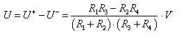 膜片進一步減薄,非線性將急劇增大,要保證微小量程的傳感器靈敏度不小于0.8mV/V,其非線性將達到15%左右。嚴(yán)重的非線性是后續(xù)電路無法補嘗的,因此必須解決傳感器芯片本身的非線性問題。下面給出壓力傳感器的非線性理論計算公式。傳感器電橋由四個橋臂R1,R2,R3,R4組成。供橋電源電壓為V,在R1和R4上的分壓分別為U+和U-,即: