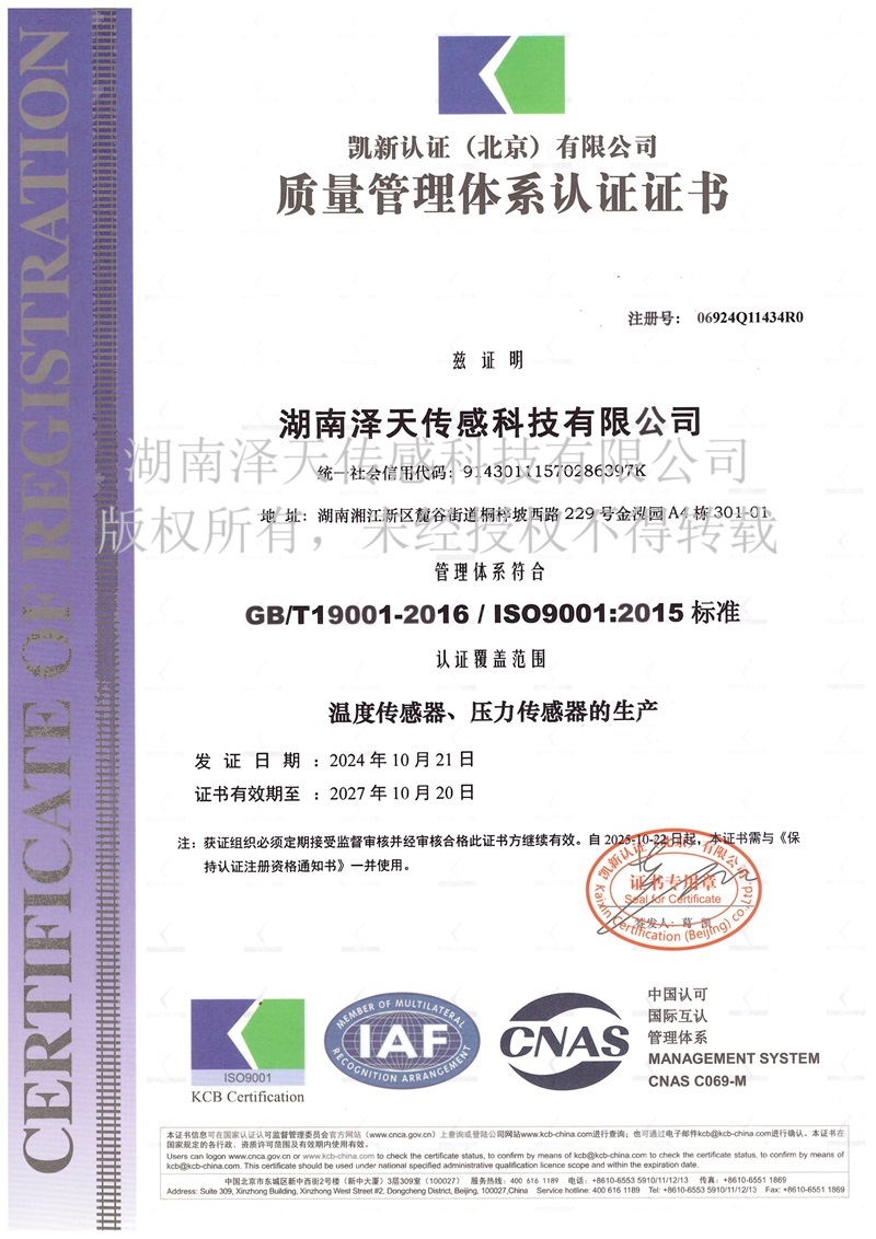 湖南澤天傳感通過(guò)ISO9001質(zhì)量管理體系認(rèn)證